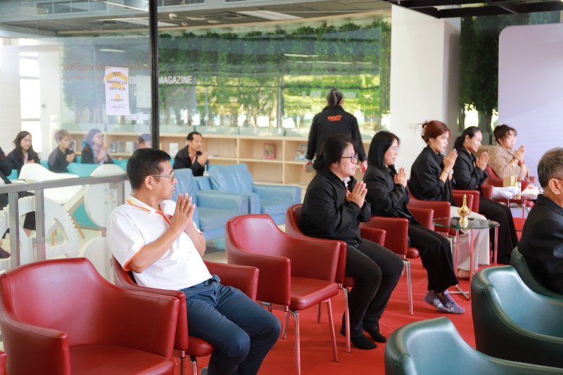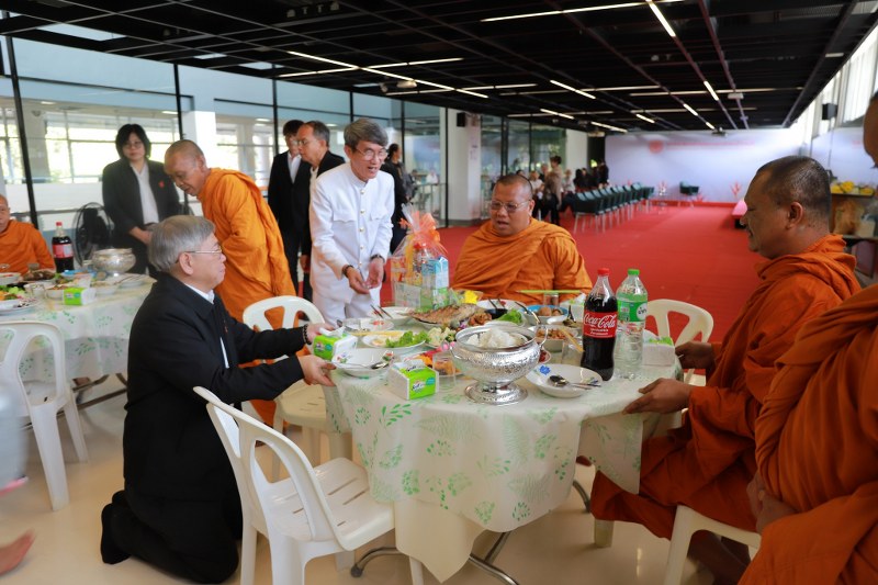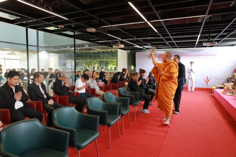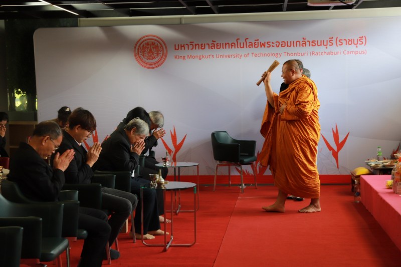 จากนั้นเวลา 10.00 น. ได้ประกอบพิธีสงฆ์และถวายภัตตาหารเพลแด่พระสงฆ์ จำนวน 9 รูป ณ บริเวณ Open Classroom ชั้น 2 อาคารหอสมุด มจธ. ราชบุรี